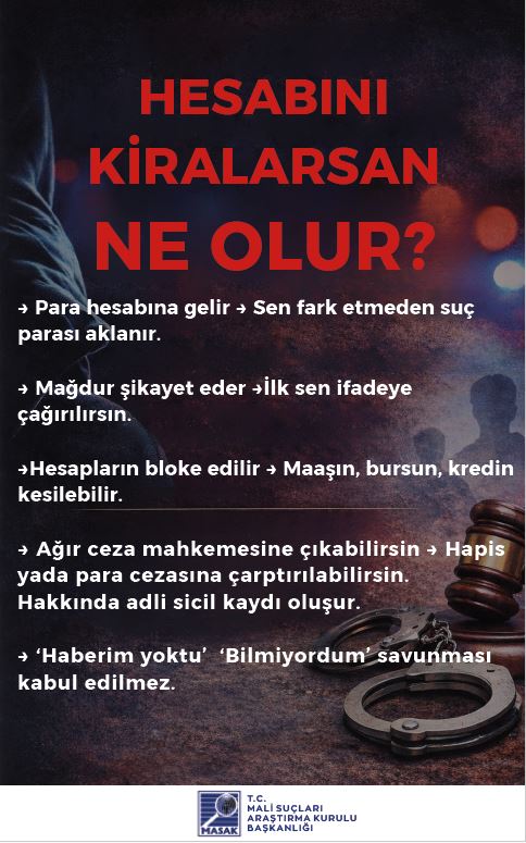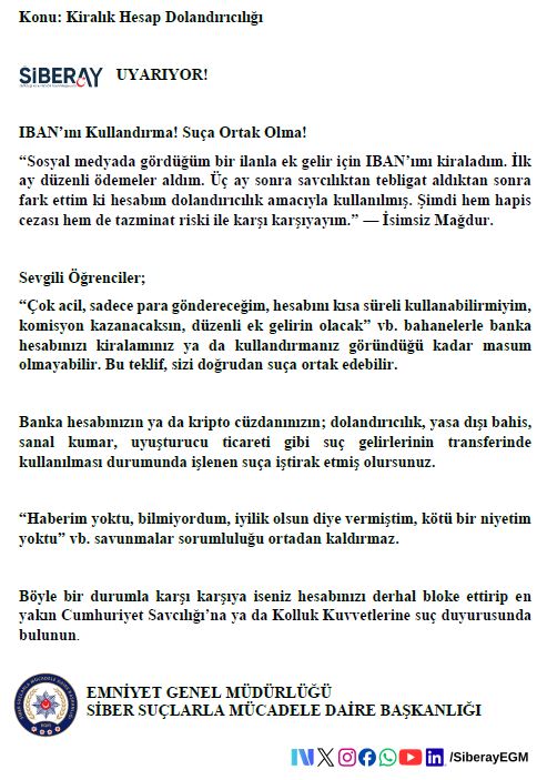 Tanıdığınız ya da tanımadığınız kişilerden gelen, hesap veya IBAN paylaşımı karşılığında kazanç vaadi içeren her türlü teklifi reddetmeniz ve şüpheli durumları derhâl güvenlik yetkililerine bildirmeniz önem arz etmektedir.
