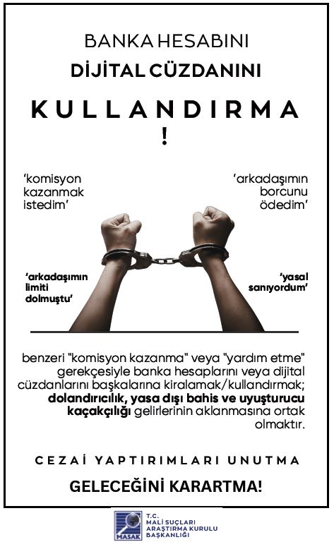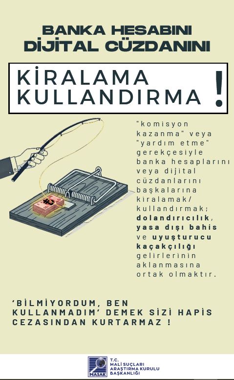 Kendi adınıza kayıtlı banka hesaplarınızın veya dijital cüzdanlarınızın; “komisyon kazanma”, “borç ödeme yardımı”, “sadece bir kez kullanma”, “zararsız para transferi” veya benzeri gerekçelerle başkaları tarafından kullanılmasına bilerek ve isteyerek izin verilmesi, Türk Ceza Kanunu ve ilgili mevzuat kapsamında cezai ve hukuki sorumluluk doğurabilir. Hesaplarınız üzerinden gerçekleştirilen işlemlerden, işlemi fiilen yapan kişi kim olursa olsun, hesap sahibi olarak siz sorumlu tutulabilirsiniz.
