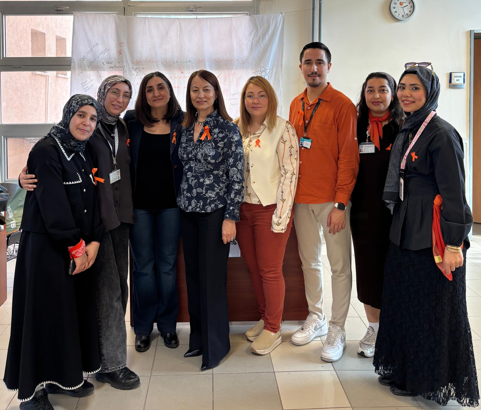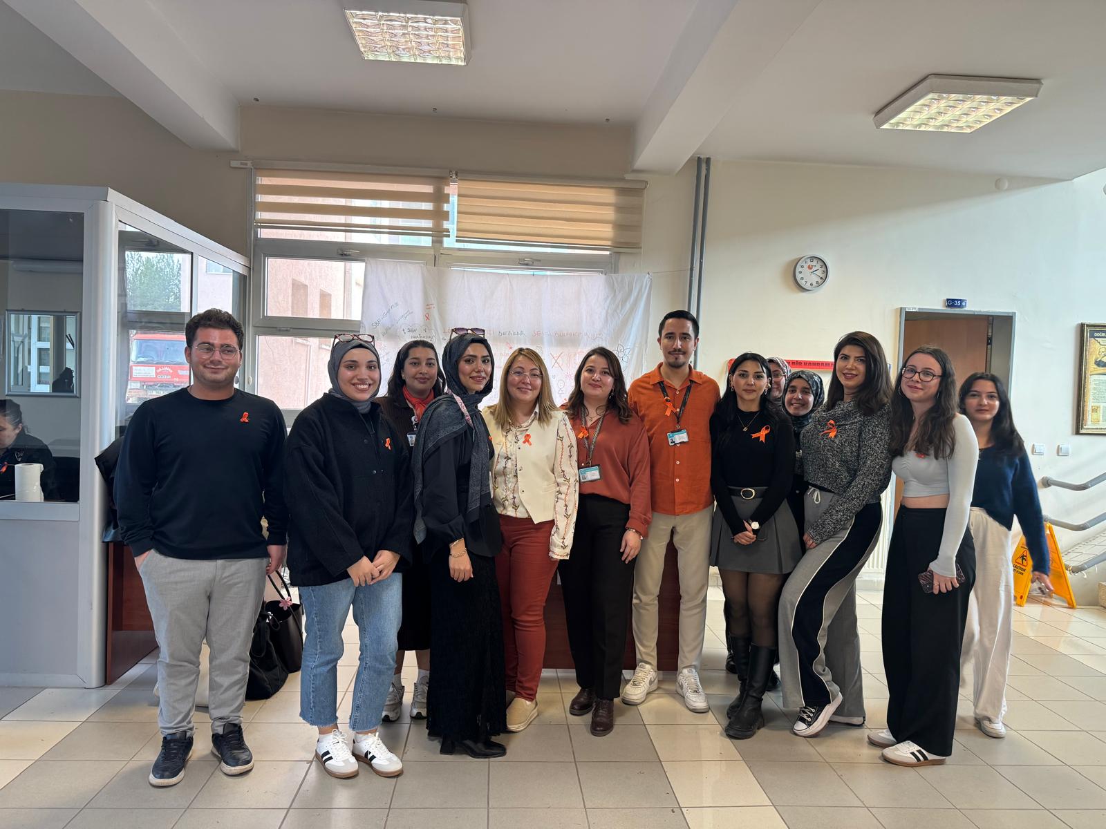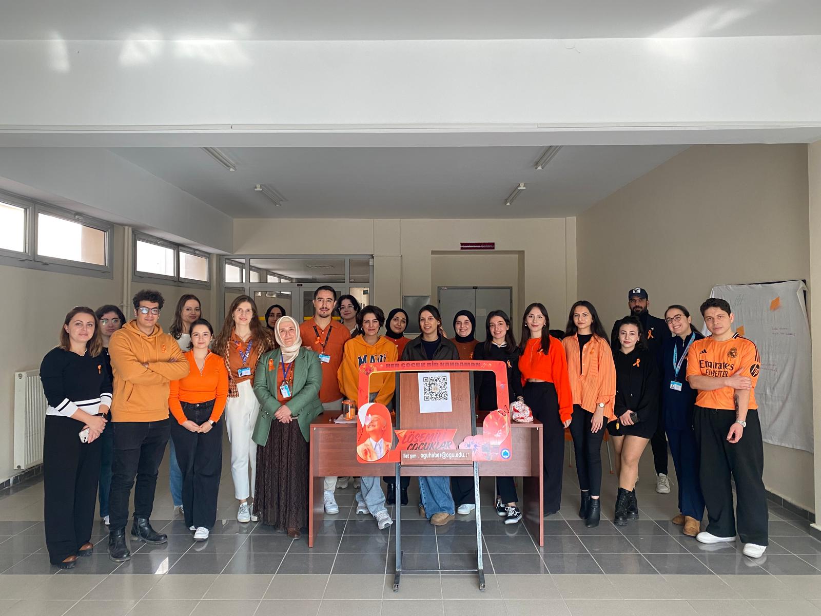 Katılımcılara turuncu kurdele dağıtılarak farkındalık sembolü oluşturuldu,